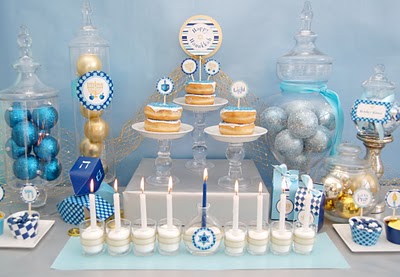 This gorgeous Hanukkah dessert table is from the Frog Prince Paperie. The details are beautiful, and I'm loving the blues, gold and silver!