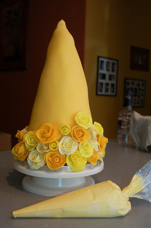 Color remaining fondant to match your darker roses. Roll fondant out, and cover the cone of cake. I'm like a broken record at this point, but it doesn't have to look great, really! You can see in the photo how I didn't quite roll the fondant wide enough and had to do a patch job. It's all going to get covered. This is not the time to worry about how the cake looks.