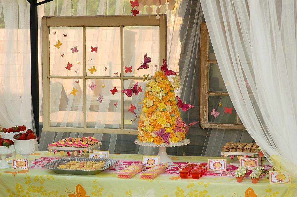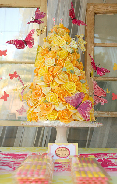 Use royal icing (colored to match your roses) to attach the roses to your tower of cake. Once all the flowers are placed, use royal icing or clear piping gel to fill in any gaps with the fondant leaves. Insert butterflies (found at any major craft store) so that they give the appearance of swarming around the cake.