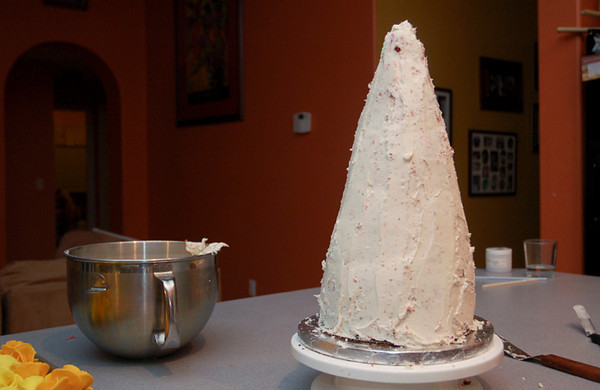 Use a large serrated knife to cut off excess cake, creating a cone shape. Again, it doesn't have to be perfect. Just get the general shape. Keep all those delicious cake scraps to feed the family or make cake balls.