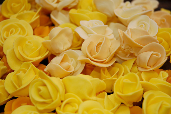 Make approximately 200 fondant roses to cover a cake this size. Gradation of color makes the cake much more interesting, so I made four batches of fondant, one with just a touch of Americolor Lemon Yellow food coloring, one with more intense Lemon Yellow, one with a light touch of Egg Yellow, and one with deeper Egg Yellow. This is the technique I use to make fondant roses. This process takes many hours, and can be done days or even weeks ahead of time. It is important that the roses be made at least several hours before placed on the cake, so that they have a chance to dry. If the roses are placed on the cake as you make them, they will compress under the weight of the roses above. It won't look as pretty, and you'll have to make twice as many roses. Trust me, you don't want to make more roses than strictly necessary.