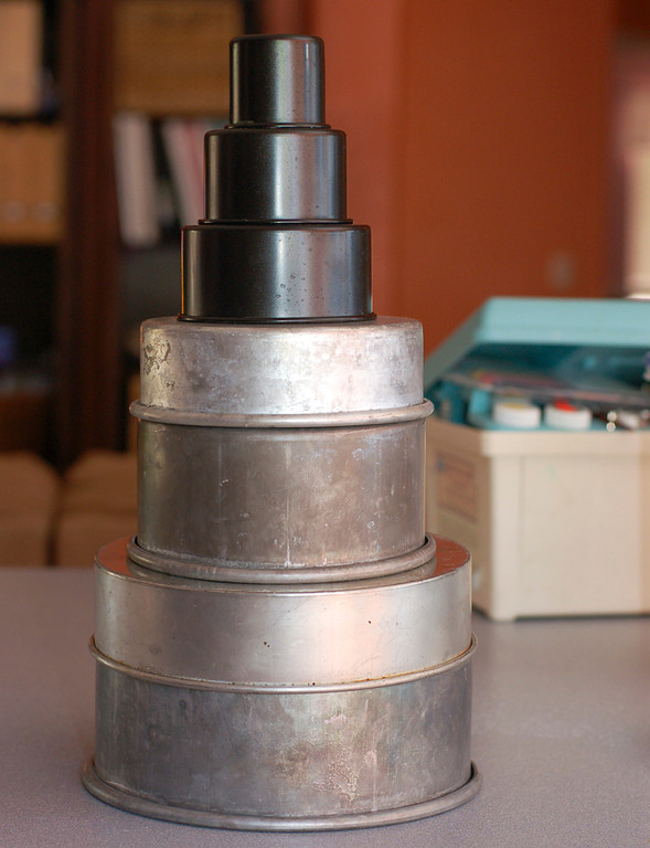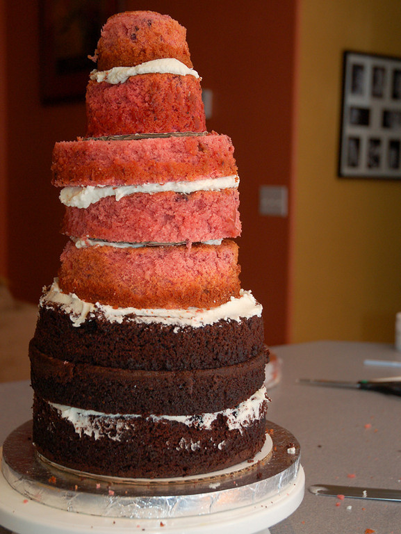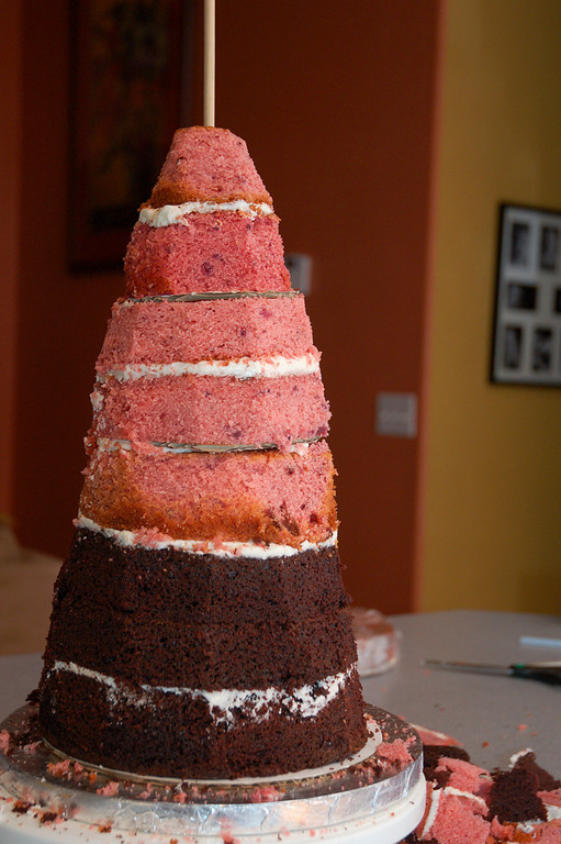 I do my best creative work when I can play around with actual materials, so stacking cake pans turned out to be the best way for me to figure out what sizes of cakes I needed to bake. For this cake, I baked three 8" layers, two 6" layers, and one each of the 4, 3, and 2" diameter layers.