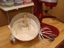 I will mix with my electric mixer and the wire whip until the mixture is light and fluffy. I use a pastry brush to paint the bottom and sides of the pan with the pan grease.