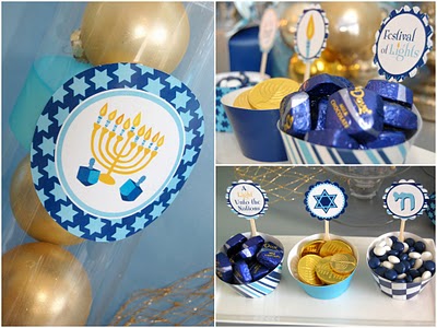 This gorgeous Hanukkah dessert table is from the Frog Prince Paperie. The details are beautiful, and I'm loving the blues, gold and silver!