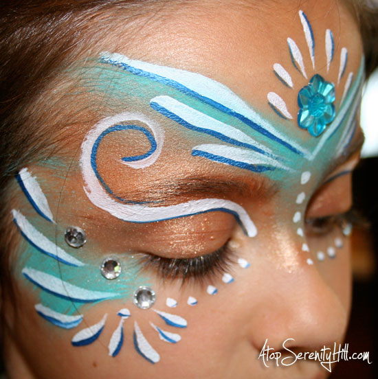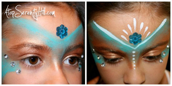 One of the best parts of this design is that by changing the colors, you can customize the fairy princess so it is the favorite of your kids. This color scheme works great for Cinderella or even Ariel (just add a shell jewel instead). Add red jewels to this design and you have Snow White. Use more greens and you have Tinkerbell or Tiana. At the fairs, when we get a request to be a specific princess, we just ask the little girl, "What is that princess's favorite color?" Then we customize the design around that answer. They always love the results, especially the glitter!